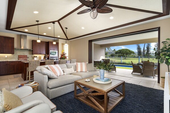 The open-concept great room welcomes you with rich wood tones, vaulted ceilings, and plush seating oriented toward sweeping golf course views. A large Smart TV anchors cozy movie nights, while sliding glass doors invite the island breeze. Adjacent is a bright dining space for six, perfect for leisurely breakfasts or candlelit dinners.