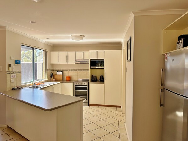 Downstairs the villa has a modern kitchen with premium stainless steel appliances + a Nespresso coffee machine some pods are provided on arrival along with a few various Tea & sugar. The laundry has a front load washing machine & dryer with separate second toilet. The open plan lounge kitchen and dining area has a television, blue ray DVD player and Bluetooth stereo.