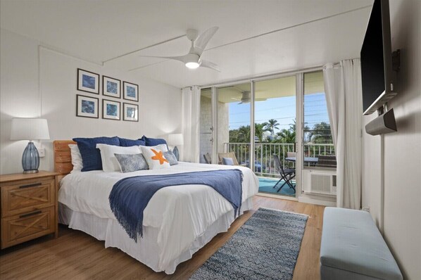 • Back Bedroom #1: Choose between a King bed or two twins (available upon request), plus a TV and closet for convenience.