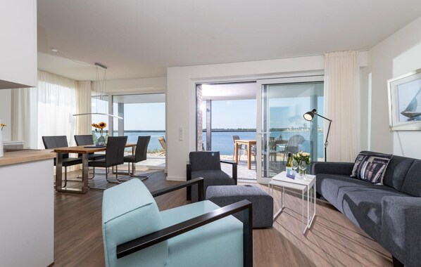 This stylishly furnished holiday apartment is located on a narrow spit of land in the middle of the Baltic Sea, between the Baltic Sea on one side and the sailing and sports boat harbour of OstseeResort Olpenitz on the other.