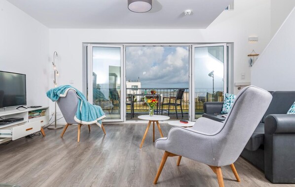 The living/dining area of the holiday apartment is flooded with light and has floor-to-ceiling panoramic window frontsWater as far as the eye can see. Fantastic views open up from the wooden terrace directly adjacent to the dining area, overlooking the sailing and sports boat harbour of OstseeResort Olpenitz. Harbour cinema and all-day sunshine are guaranteed and ensure that there is never a dull moment.