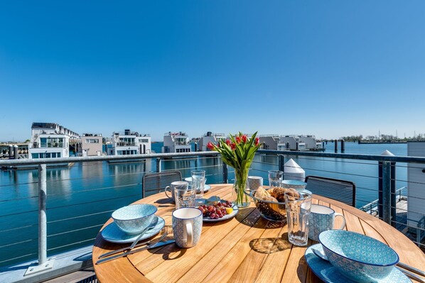 Outdoor dining - Water house "The Nordic House" at Ostseeresort Olpenitz - sun deck & sea view (Olpenitz)