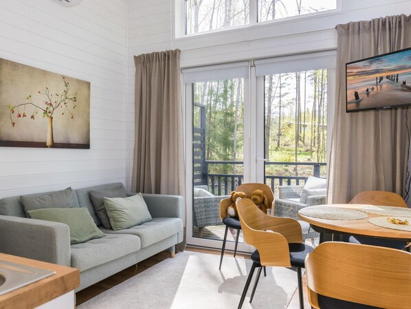 The villa has a unified living room and open-plan kitchen, with access to a spacious terrace. It features an air source heat pump, a bedroom with a bunk bed (lower bed 140x200 cm, upper bed 90x200 cm), and a low loft with two beds. The loft can be accessed via a movable ladder. The bathroom has a shower, WC, and washing machine (the villa does not have its own sauna). The spacious terrace is furnished with high-quality garden furniture, a gas grill, and a sunshade.