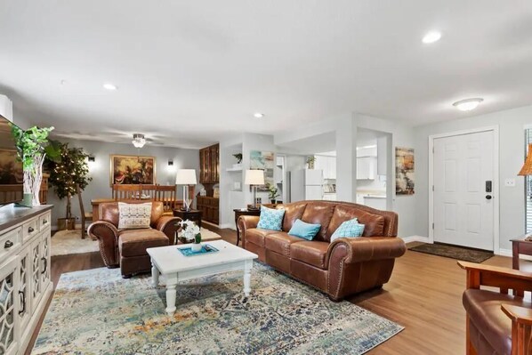 Bring the whole family to this great place with lots of room for fun. Three bedrooms and two bathrooms with a large central great room, dining room and kitchen. Spread out in this private, spacious home with a fenced back yard with large trees.