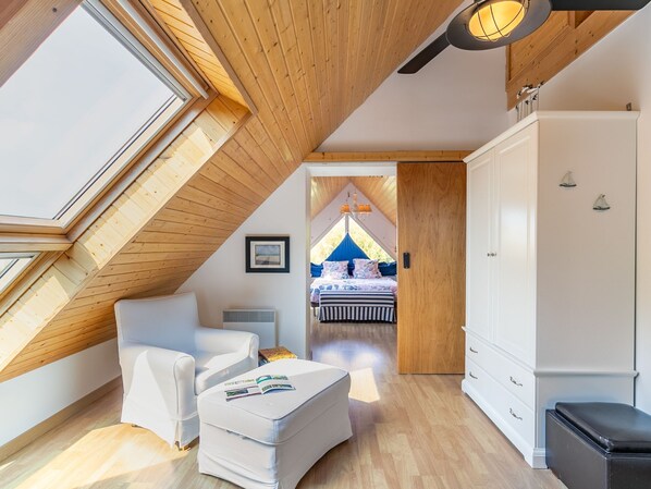 "Ker Simor Ty Mer", 5-room house 120 m2 on 2 levels. Bright, comfortable and tasteful furnishings: living/dining room with Scandinavian wood stove and dining table. Exit to the terrace. 1 room with 1 french bed (160 cm), shower. Open kitchen (oven, dishwasher, 5 gas rings, toaster, kettle, microwave, freezer, electric coffee machine). Sep. WC. Upper floor: living room with sloping ceilings with TV, hi-fi system, DVD and electric heater. 1 room with sloping ceilings with sliding door with 1 french bed (160 cm), electric heater. 1 room with sloping ceilings with 2 beds and electric heater. Bath/WC. Electric heating. Terrace. Terrace furniture, barbecue (portable), deck chairs (4). Facilities: washing machine, dryer, iron, children's high chair, baby cot. Internet (WiFi, free). Please note: non-smoking house. Smoke alarm.
