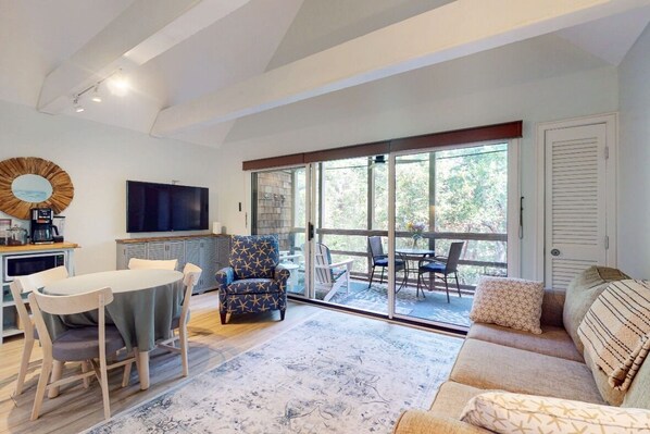3575 Seascape Villa boasts an open living, dining, and kitchen area that features sliding doors leading to a furnished screened-in porch with scenic wooded views. The living room includes a sleeper sofa for additional guest accommodations, while the compact kitchen is fully equipped with all the essentials needed to prepare delicious meals at home.