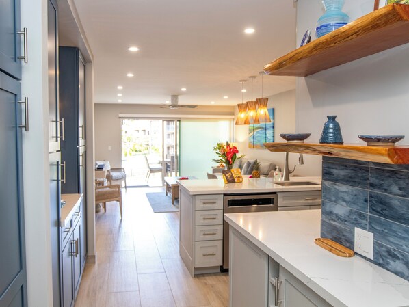 Welcome to our Ocean inspired condo! This popular unit completed a stunning remodel in 2024 and includes all new furniture, custom pantry and kitchen cabinetry, stainless steel appliances, tile flooring, quartz countertops and matching table. The designer bathroom layout, tile and fixtures match the Maui beach feel within the condo. For your comfort a wonderfully quiet split AC system was installed in the bedroom and living room in addition to ceiling fans. The bedroom has a brand new resort quality mattress with high quality bedding, closet organizer and ample storage space. For those working remotely, you will find a drop down desk too. This condo is fully stocked with everything you need by owners who spend their vacation here. With local Hawaiian Artwork showcased throughout, this condo will not disappoint. You have views of the west Maui mountains from inside and an ocean view from the lanai - simply beautiful. Two pools, BBQ facilities and a pickleball/tennis court round out the on site amenities. And, our favourite part, five minutes away from glorious Kihei and Wailea beaches. Enjoy.