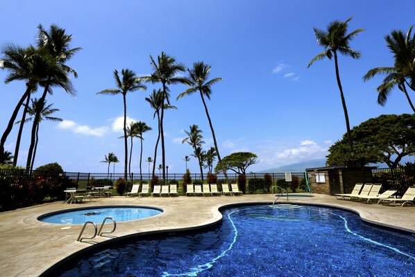Located oceanfront in North Kihei, Kauhale Makai (in Hawaiian, “Village by the Sea”) is the ideal location for a family or couples retreat. Two buildings with 168 units total stretch towards the ocean on tropical grounds. The complex provides shuffleboard and volleyball courts, a pool, a children’s wading pool, hot tub, a putting green as well as gas barbecues. Each well-appointed unit includes its very own private lanai (balcony). The complex also has coin-operated laundry facilities on property for your convenience. Kauhale Makai’s location on South Kihei Road makes it the perfect base for exploring this magical island. Just minutes away are some of the world’s most beautiful beaches, superb shopping, renowned restaurants, and world-class golf.