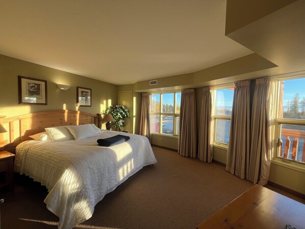 The living room is cozy and inviting, featuring a gas fireplace, Fire TV with standard cable, and comfortable seating. A small desk is also available if you need to catch up on work or plan the next day’s adventures. Large windows and patio doors bring in plenty of natural light and offer access to the balcony.