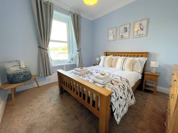 Bedroom 1:- The Harbour Room celebrates Kirkcudbright Harbour and is decorated in relaxing hues of blue and white.