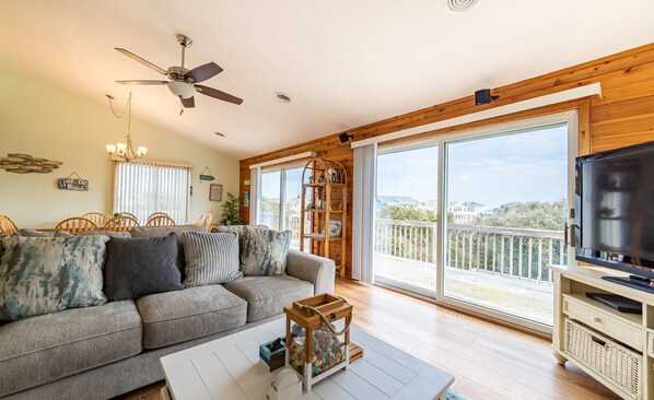 This oceanside home features 5 bedrooms and 3 and a half baths with plenty of room for a large family. On the upper level you'll find the open great room with flat screen TV, access to the sun deck, dining area with table which seats 10 guests, a fully stocked kitchen with breakfast bar and 3 bar stools, a half bath and the master bedroom. On the mid level are the remaining bedrooms; 2 with queens, 1 with 2 twins and 1 with 2 bunk sets along with a hall bath. Outside, you'll enjoy the large pool (14x33), tiki bar and hot tub. Pool toys and poolside furniture are provided and there's a convenient full bathroom and kitchenette in the pool area.