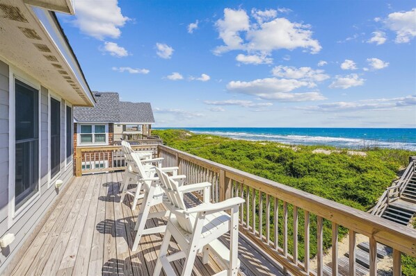 Top Level: This level, which features a great room that showcases expansive ocean views, beautiful hardwood floors, top-of-the-line décor and furnishings, a gas fireplace, and an abundance of windows overlooking the great Atlantic, will please everyone in your group! The kitchen offers plenty of space for preparing large family meals to be enjoyed at the dining table and also overlooks the ocean. In addition, there is a wet bar for preparing evening cocktails!