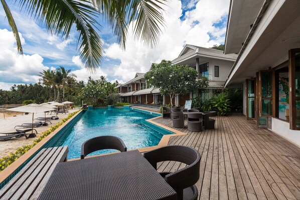 Ocean views warm the spirit at this beachfront resort where guests can relax on a private stretch of sand with convenient sun loungers