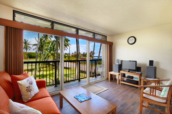 This condo in Poipu is cozy and charming. It will accommodate you in style and proximity on the south shore of Kauai, with the sounds of the ocean and palm trees to cradle your sleep, a beautiful view to the ocean from the lanai, and all the comforts of home. During the day, many ocean activities - snorkeling, surfing, swimming, boating, beach going - are at your doorstep with other parts of Poipu and the small town of Koloa just minutes away. This is as relaxing as it gets!
