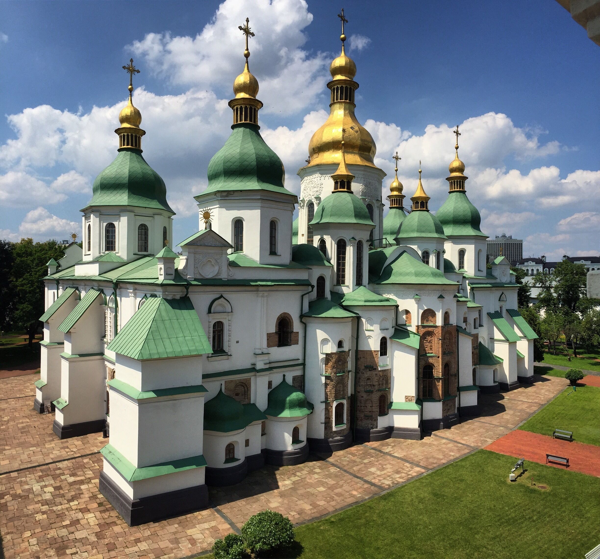 Kyiv's Verkhnie Misto showcases Ukraine's rich cultural heritage through golden-domed churches and historic landmarks. St. Sophia's Cathedral and St. Michael's Monastery stand majestically among cobblestone streets. The area buzzes with artistic energy along Andriyivskyy Descent where local artisans display traditional crafts. Visitors can explore museums and the National Opera within this pedestrian-friendly district. Cosy cafes and traditional Ukrainian restaurants offer authentic local flavours between sightseeing stops. The elevated position provides stunning views of Kyiv and the distant Dnieper River.