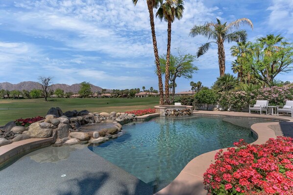 Experience 270 degrees of unobstructed views on the private Weiskopf course at PGA West in this spacious home. Unwind by the oversized lagoon pool, river rock waterfall and spa or enjoy outdoor seating with a gas firepit and relaxing waterfall feature.