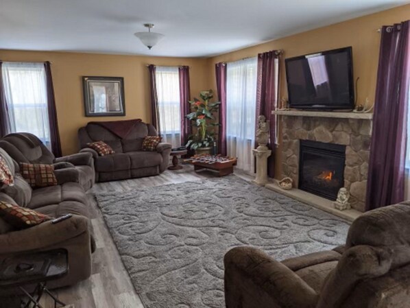 The main level features a living room with gas fireplace, a 50' Plasma TV and a BluRay player with Free Netflix viewing and Roku. The sofa and love seat both recline and are so comfortable that you may just want to sleep right there. The main level also features the dining room, kitchen, a full bath, laundry area complete with washer and dryer, the master bedroom, and a separate make-up vanity area.