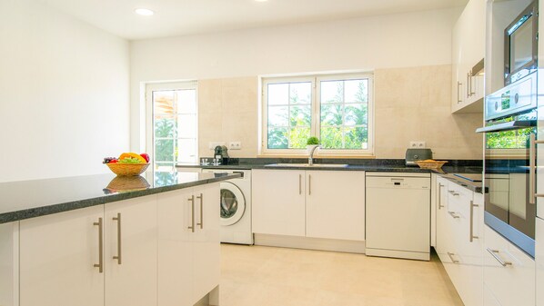 In de keuken was alles aanwezig en lekker ruim.Ondanks warme weer,was het zwembad erg koud.Veel gedoe gehad met de electrische poort,afstandsbediening stuk bij aankomst,toegangsdeur geblokkeerd,Bij vertrek algehele stroomuitval,dus werkte het electra van de poort ook niet,noodnummer niet bereikbaar, uiteindelijk de poort uit geleidingen getilt.Slordig dat er geen handbediening op zit,we zaten totaal ,opgesloten, tot 2 maal toe!