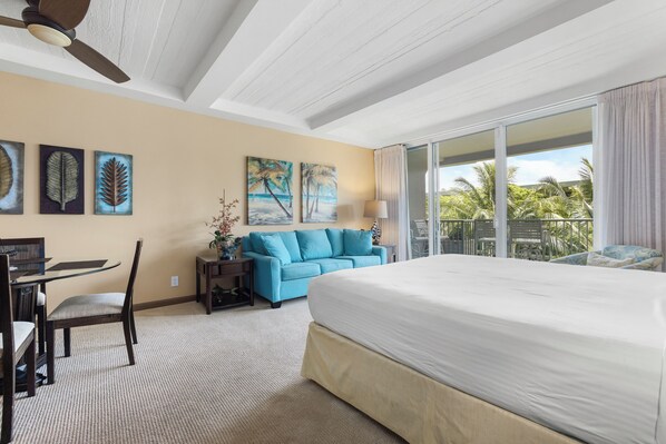 Upgraded and Renovated studio ocean-view condo at the Whaler on Ka'anapali Beach. This spacious studio can sleep up to 3 people. There is a California King bed and a Queen sofa sleeper. Located on the 5th floor and a short walk to the beach. There is a partial Ocean View from the lanai. There is a 37-inch TV in the living room and a large walk-in closet next to the bathroom. The kitchen features Granite Counters and stainless-steel appliances. There is also a Queen Sofa Sleeper which allows for up to three guests.