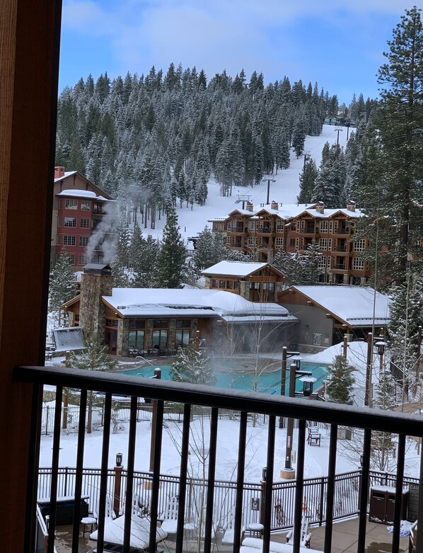 At the Ski-in, Ski-out Resort, unwind in a spacious living room with a large flat screen TV and surround sound. Enjoy high-end amenities like an indoor fireplace and private balcony or explore the resort village across the street with ice skating, shopping and restaurants.