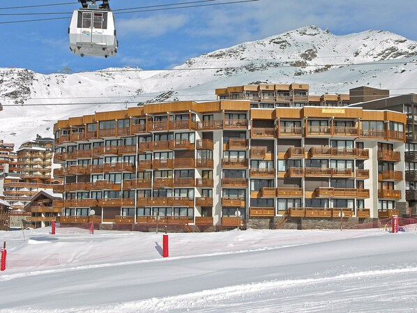 Residence "Le Roc de Peclet". Above Val Thorens, in the district of Péclet, in a quiet, sunny position, excellent location: right in the centre but still quiet, 900 m from the lake, 50 m from the skiing area, south facing position. In the complex: storage room for skis, central heating system. Motor access (mountain road). In Winter: please take snow chains. Public car park at 300 m, extra. Shop 350 m, grocery 200 m, supermarket 200 m, shopping centre, restaurant 200 m, bakery 350 m, café 200 m, pedestrian zone 500 m, 5 minute walk to the centre, bus stop "navette gratuit(Hiver)". Cable car 50 m, chair lift, skisport facilities 100 m, slopes 50 m, ski school 500 m, ski-kindergarten 10 m, ice rink 200 m. Well-known ski regions can easily be reached: 3 Vallées. Well-known lakes can easily be reached: Lac du lou 1 km, Lac Menuires 800 m. Please note: no lift. Groups of teenagers on request only. The owner does not accept any youth groups. In case of good snow conditions, the house is accessible on skis. The keys‘ handover takes place by the agency Interhome ValThorens. No lift.