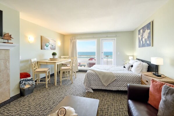 Escape to No. 214 at D Sands Condominiums, where ocean views and cozy comforts blend seamlessly together. Enjoy the fully-stocked kitchenette, gas fireplace in the living room and a private balcony perfect for watching sunsets over the water.