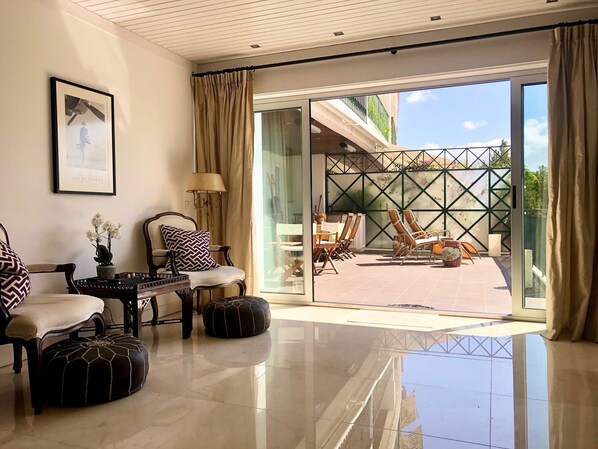 The apartment is in the very centre of Cascais, close to the marina and the cobblestone heart. From it, you can walk around town, to the beaches, and to plenty of cafés, shops and dining. It is an ideal location from which to explore the area. This is a spacious apartment with comfy bedrooms, a modern kitchen, and spacious living areas. Wonderful large terrace off the living room is ideal for relaxing, sundowners and enjoying the sunset overlooking the pool. NOT SUITABLE FOR CHILDREN UNDER 13