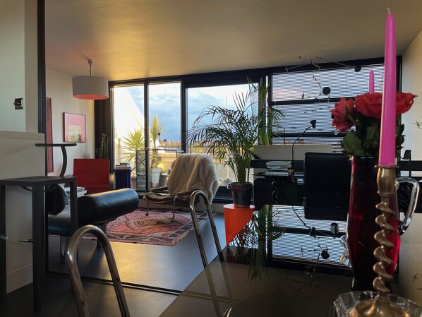 Perched in St Johns Wood, this 2-bedroom modernist penthouse apartment offers a unique retreat. Open-plan living areas feature original artwork, designer furniture and books; the well-equipped kitchen is perfect for culinary creations. Unwind on the large terrace with views of London.