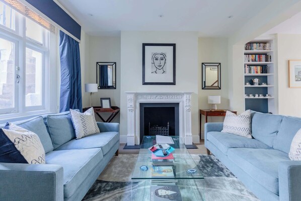 The heart of the home, this spacious open-plan living and dining area is full of character and charm. Two soft, inviting sofas offer the perfect spot to relax after a day out in the city, whether you're unwinding with a book from the curated shelf, enjoying a glass of wine, or catching up on your favourite shows on the wall-mounted smart TV. Thoughtfully chosen artwork and decorative touches give the space a stylish, lived-in feel, while the elegant fireplace adds a quintessentially British cosiness.