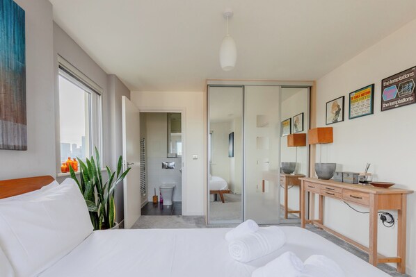 Master Bedroom: Step into the serene sanctuary of the master bedroom, a space designed for ultimate relaxation. The centrepiece of the room is a plush double bed, dressed with hotel quality and soft pillows. Make yourself at home and unpack with a large wardrobe available, which includes full-length mirrors, making getting dressed up for your London adventures a breeze. The soothing colour of white and grey walls, artwork and large windows illuminating the room create an ambience of understated luxury.