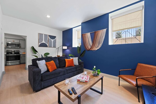 ▻ Living space- features a comfortable sleeper sofa set with plushy pillows, a flat-screen 55” TV, coffee table, and a laptop friendly work area