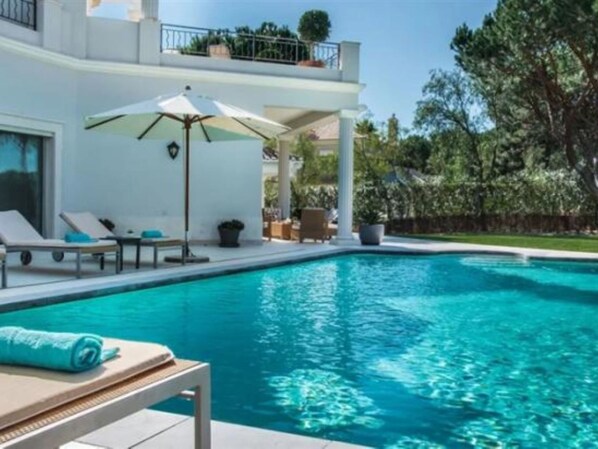 Quinta do Lago: Very cosy, luxurious villa "Dior", detached. In the district Quinta do Lago, residential area (villas), 6.1 km from the sea. Private: swimming pool angular (5 x 8 m, depth 90 - 190 cm, seasonal availability: 01.Jan. - 31.Dec.). In the house: WiFi, air conditioning, washing machine. Room cleaning weekly on request (included). Grocery 3.3 km, supermarket 1.9 km, shopping centre 1.8 km, restaurant 2.3 km, bar 3.3 km, bakery 1.9 km, café 3.3 km, bus stop 5.1 km, sandy beach "Beach Garrão Nascente" 6.1 km. Marina 15.1 km, golf course (18 hole) 5.9 km, surf school 14.9 km, tennis 5.4 km, children's playground 5.9 km. Nearby attractions: Quinta do Lago 4.3 km, Casino Vilamoura 13.2 km, Faro International Airport 15.3 km, Algarve Buggy Tours 9.6 km, Karting Almancil 6.9 km, Aquashow Waterpark 8.9 km. Please note: car recommended. Suitable for families. Loading and unloading of baggage is possible at the holiday house.