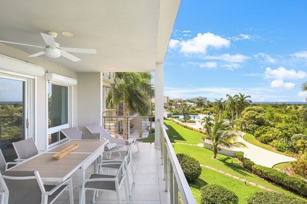 - A large terrace with a view of the lagoon, golf course, and sea