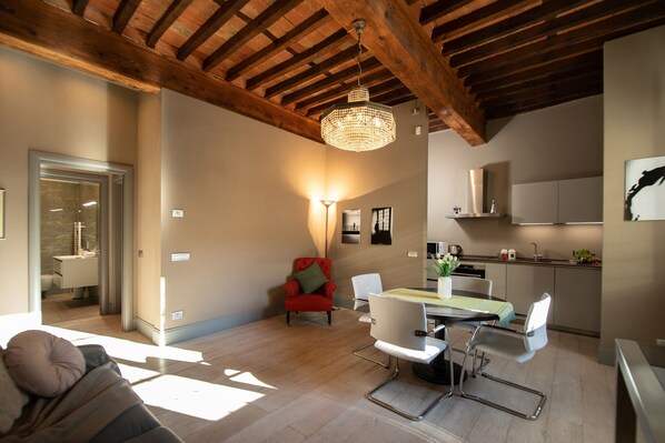 This modern, tastefully furnished apartment is located in a strategic position within the city of Lucca, just a few steps from the beautiful Guinigi Tower. Equipped with air conditioning, the accommodation offers everything necessary for a comfortable stay, with a fully equipped American kitchen, including a refrigerator, freezer, oven, microwave, dishwasher and all the utensils you will need.The master bedroom is spacious and bright, with a comfortable king-size bed, while the sofa bed in the living room can accommodate two more guests. The apartment also has a full bathroom with a shower. Thanks to the free WiFi connection, you can stay in touch with your loved ones during your stay. Furthermore, the apartment is only 600 metres from Lucca train station and 800 metres from the bus station, making it easily accessible.In the vicinity, you will find a Conad City supermarket, as well as numerous delicious restaurants and cafes, such as Il Mecenate and Bar Moka, just 200 metres away. The San Luca hospital is 4 km from the apartment, while Pisa International Airport is 35 km away.This cosy apartment is ideal for families and couples who want to explore the beauty of Lucca and enjoy a relaxing holiday in a convenient and well-served location.
