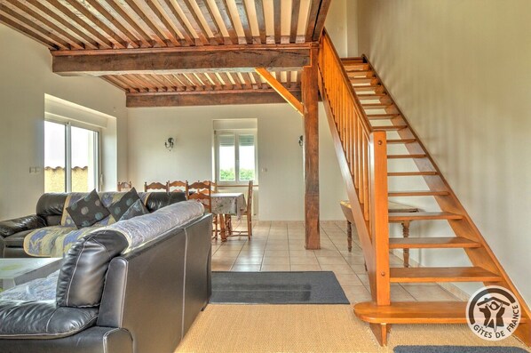 In countryside setting, this gîte is ideal for a business trip or holidays close to Lyon. Very easily accessed. Main roads, Eurexpo, St Exupery airport nearby. Self-catering accommodation in group of buildings that includes 2 dwellings and owners' - former farmers - home. Goat farm on site. Ground floor: light & airy living room (lounge area, dining area, lovely beamed ceilings, many windows). Separate kitchen, WC, utility room (washing machine). 1st floor: 2 bedrooms (double bed) (2 single beds), (attic with cot, extra single bed available with extra charge of 70 euros per week). Bathroom including WC. Outdoors : private enclosed terrace (no opposite neighbours, hedge), shared courtyard. Fixed charge for cleaning service on departure : 40 euros (obligatory for long stays of 2 weeks or more). Warm welcome. In countryside setting, this gîte is ideal for a business trip or holidays close to Lyon. Very easily accessed. Main roads, Eurexpo, St Exupery airport nearby. Self-catering accommodation in group of buildings that includes 2 dwellings and owners' - former farmers - home. Goat farm on site. Ground floor: light & airy living room (lounge area, dining area, lovely beamed ceilings, many windows). Separate kitchen, WC, utility room (washing machine). 1st floor: 2 bedrooms (double bed) (2 single beds), (attic with cot, extra single bed available with extra charge of 70 euros per week). Bathroom including WC. Outdoors : private enclosed terrace (no opposite neighbours, hedge), shared courtyard. Fixed charge for cleaning service on departure : 40 euros (obligatory for long stays of 2 weeks or more). Warm welcome.