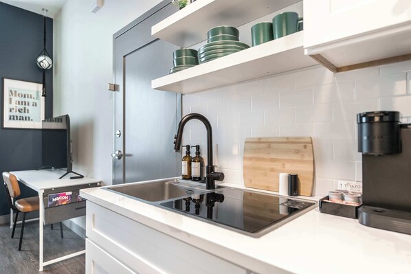 ***Inside the Space** Queen bed with plush bedding for a restful night Smart TV and high-speed Wi-Fi for entertainment and work needs Full kitchen with stove, oven, refrigerator, microwave, coffee maker, cookware, and essentials Private bathroom with shower, fresh towels, and toiletries