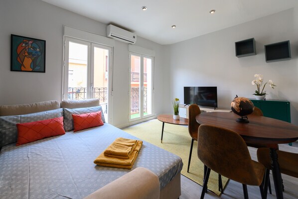 The spacious and bright living room, tastefully decorated and designed for relaxation. A large window with access to the balcony allows abundant natural light to enter, creating a warm and welcoming atmosphere throughout the day. The living room is equipped with a comfortable sofa bed, ideal for additional guests, a dining table for up to 4 people and an air conditioning unit that guarantees comfort even on the hottest summer days.