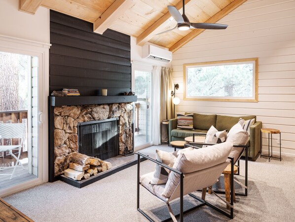 Designer-renovated retreat with vaulted ceilings, hot tub and pool access, fast WiFi, and a cozy fireplace for post-adventure relaxation.