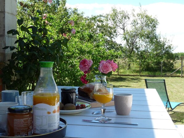 Outdoor dining - Charming Family Cottage with Large Garden, Terrace & Modern Amenities in Loire Valley (Manthelan)