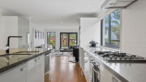 If you have a house full of guests you can cook up a storm in the entertainer's kitchen with three ovens, large five-burner gas cooktop, two dishwashers, stainless steel benchtop and built-in wine racks, as well as a hidden microwave, an oversize stone top island bench (with under-bench storage) and a Nespresso Pod Coffee Machine.