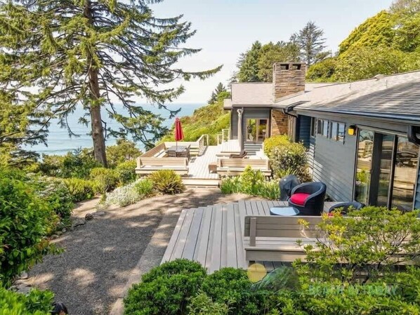 Quietly tucked away on a large and very private lot with spectacular views of the coast and ocean. Large decks to enjoy the view, and tons of room inside.