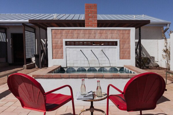 The shared courtyard is decked out with a beautiful fountain, dedicated dining area for dining al fresco, and a large outdoor fireplace to unwind under the stars. A custom BBQ grill adds to the charm for guests looking to grill and gather. The private spa-like outdoor tub area "Oasis" is reservable via QR code and features a vintage clawfoot tub. The shared sauna and cold plunge offer a one-of-a-kind relaxation experience in Marfa.