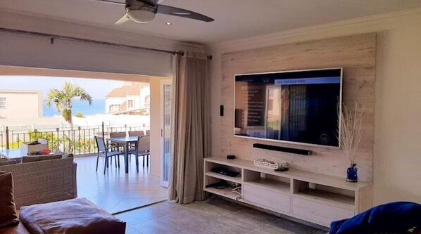 The living area opens up onto a lovely patio area ideal for relaxing and entertaining. There is outdoor patio furniture and dining furniture with braai facilities. The patio overlooks a grassed area and offers sea views.