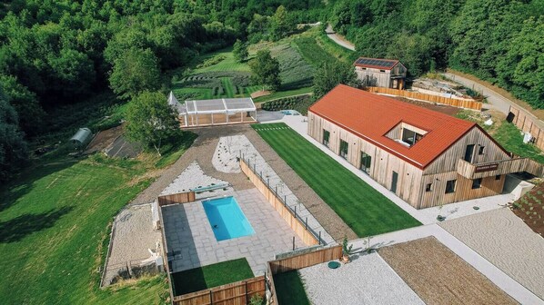 Surrounded by serene lavender fields, Štajerska Lavender Estate offers a tranquil retreat. Unwind in the spacious terrace's jacuzzi or sauna, then explore nature's magical spots and enjoy access to a pool.
