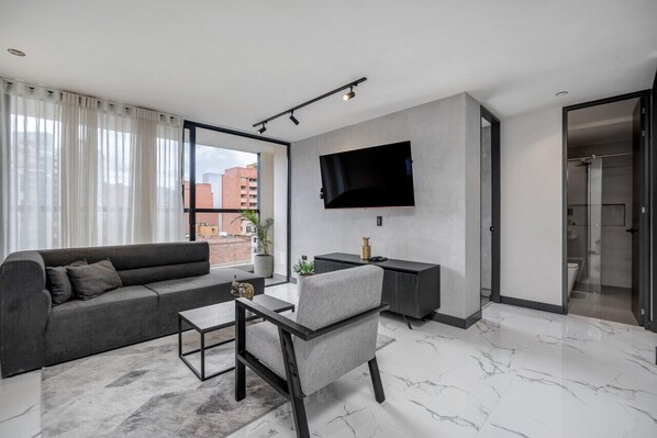 Your urban oasis is located in the vibrant heart of Laureles, allowing you to effortlessly immerse yourself in the local culture and then return to a serene sanctuary. The living area is a cozy cocoon, perfect for unwinding after a day of exploration, with the smart TV offering entertainment at your fingertips.