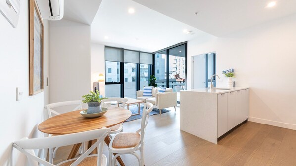 Welcome to Blue Oasis Preston – Rooftop Pool Escape, a light-filled urban retreat designed for comfort and convenience. Relax in the modern open-plan living area, cook up a storm in the fully equipped kitchen, or unwind on your private balcony after a day exploring Melbourne’s vibrant north.