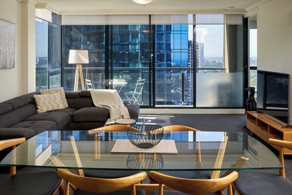 This spacious apartment boasts Scandinavian-inspired comfort, a gourmet kitchen, and hotel-style beds. Unwind in the landscaped courtyard or by the indoor heated pool, tennis court or gym. Enjoy free WiFi and tea/coffee while taking in beautiful views from the master bedroom.