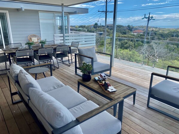 The outside El Fresco table seats 7 and the comfortable beach couches seat 5