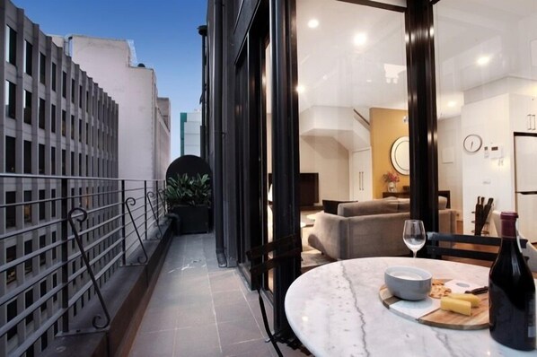 Enjoy the comforts of high-quality, artistic furnishings and appliances, with opening windows throughout for fresh air and natural light, alongside air conditioning in all main rooms for year-round comfort. The living area and private balcony overlook the bustling Russell Lane below, giving you an authentic inner-city atmosphere.