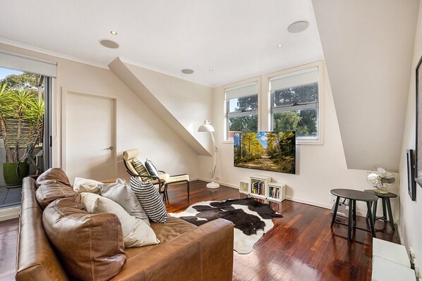 This is a stunning apartment spread across one floor. Its main living area is adorned with polished timber flooring and ample natural light. It has leather lounges, four-person dining and a well-equipped kitchen. There are two bedrooms that share a bathroom, including one bedroom with two single beds. It also has a sunny patio with a barbecue.